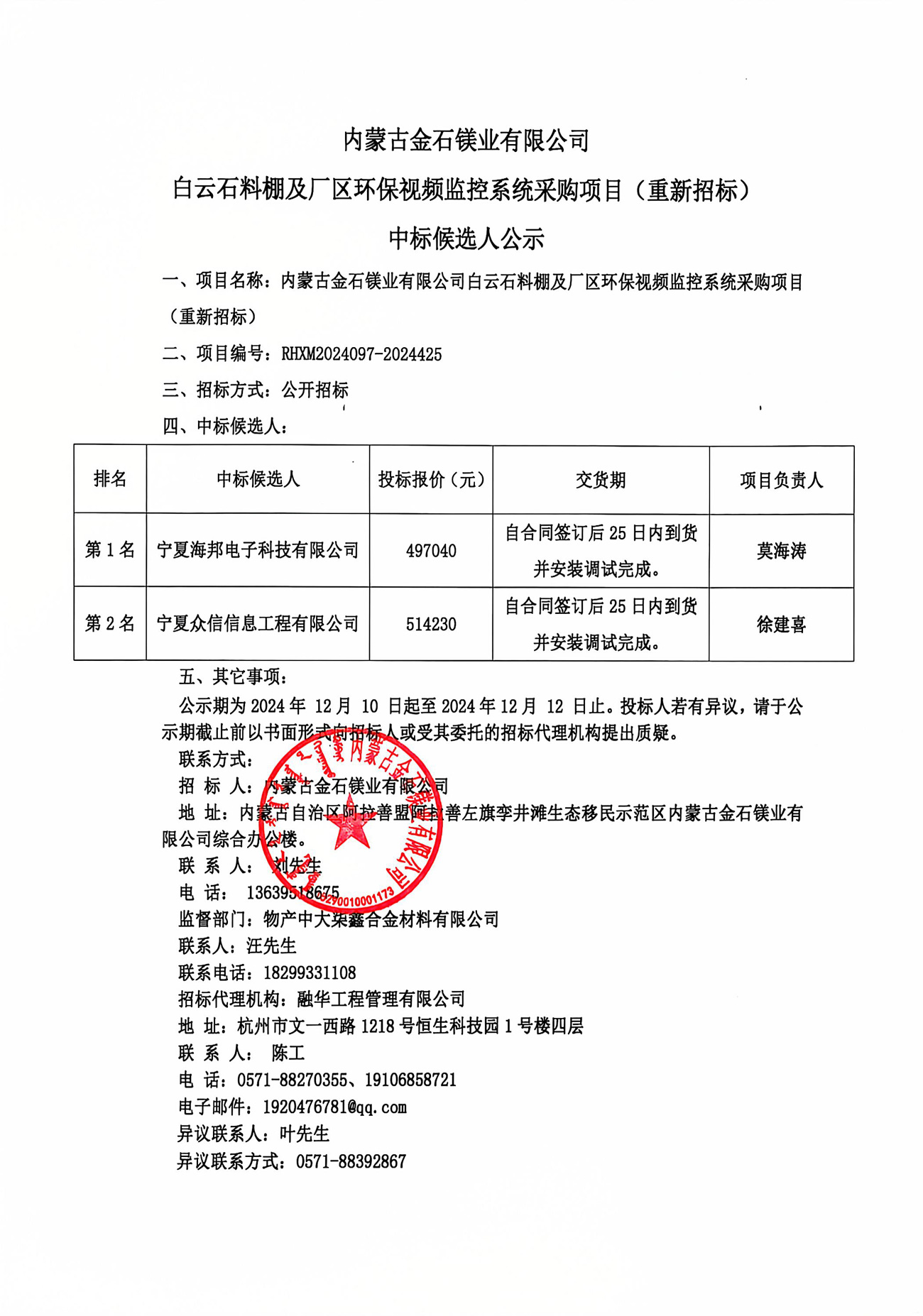 内蒙古金石镁业有限公司白云石料棚及厂区环保视频监控系统采购项目(重新招标)中标候选人公示