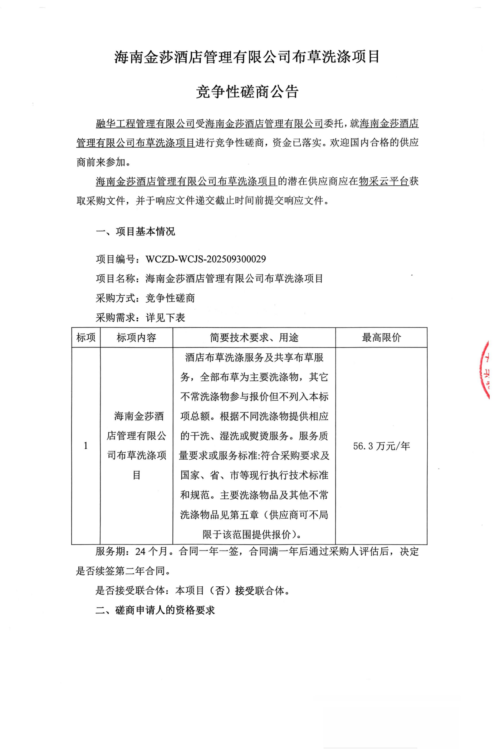 海南金莎酒店管理有限公司布草洗涤项目竞争性磋商公告