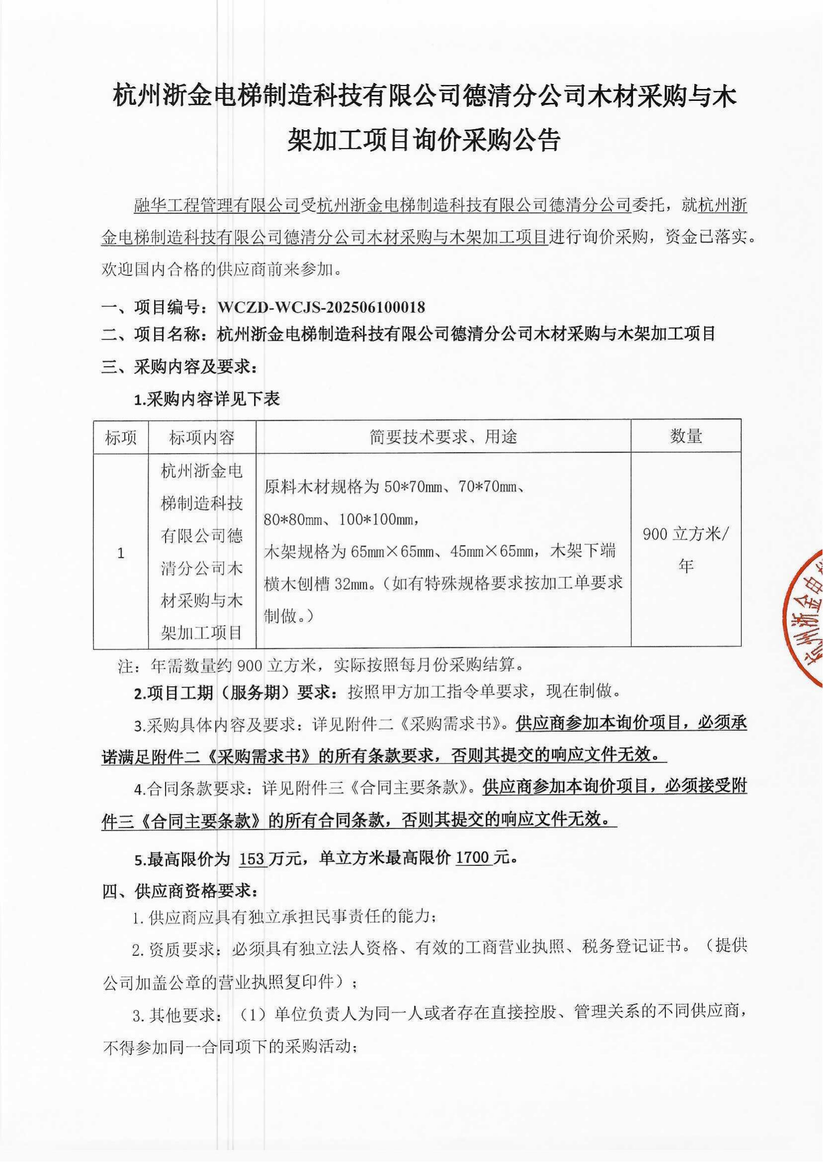 杭州浙金电梯制造科技有限公司德清分公司木材采购与木架加工项目询价采购公告