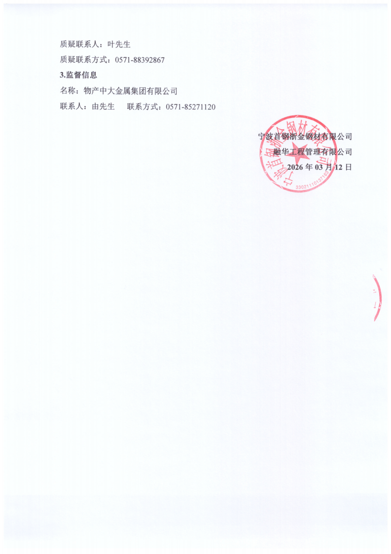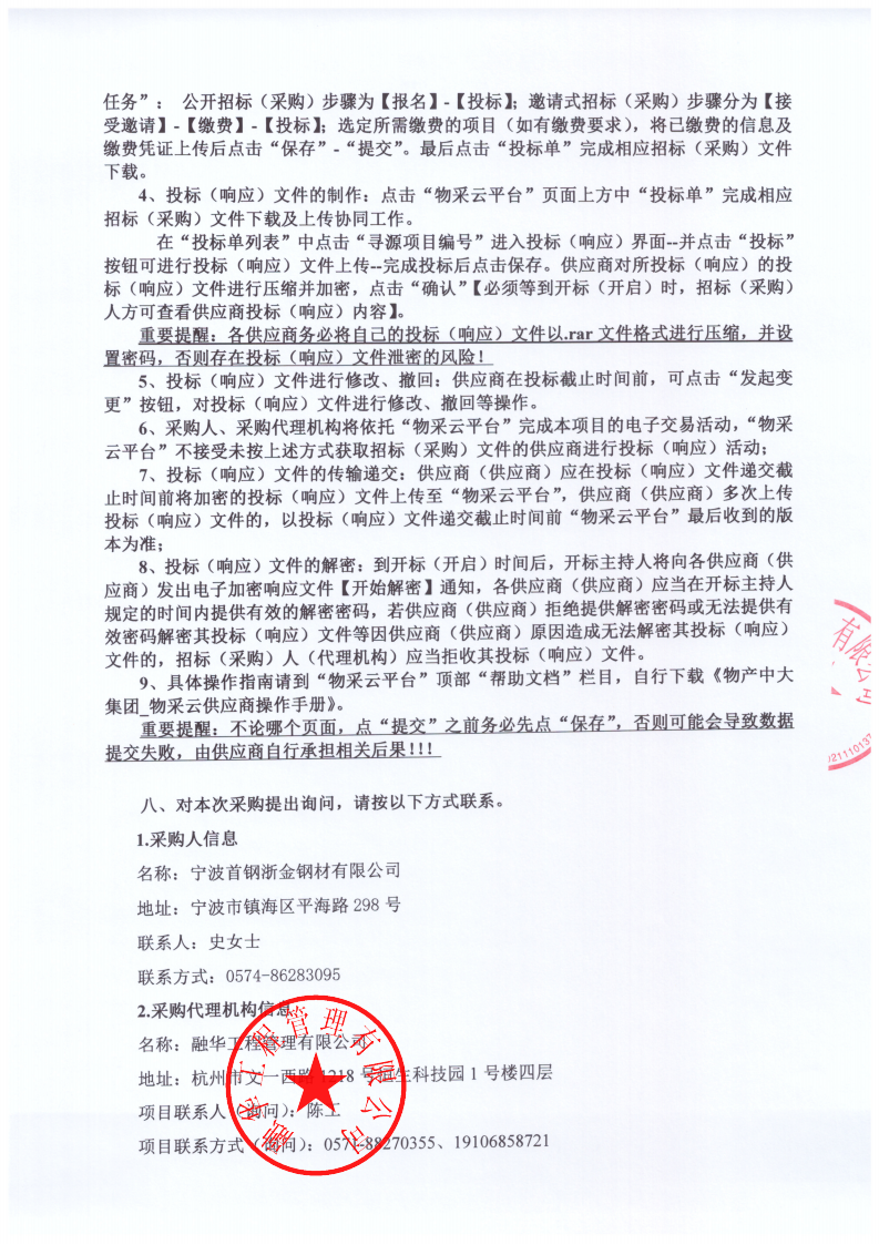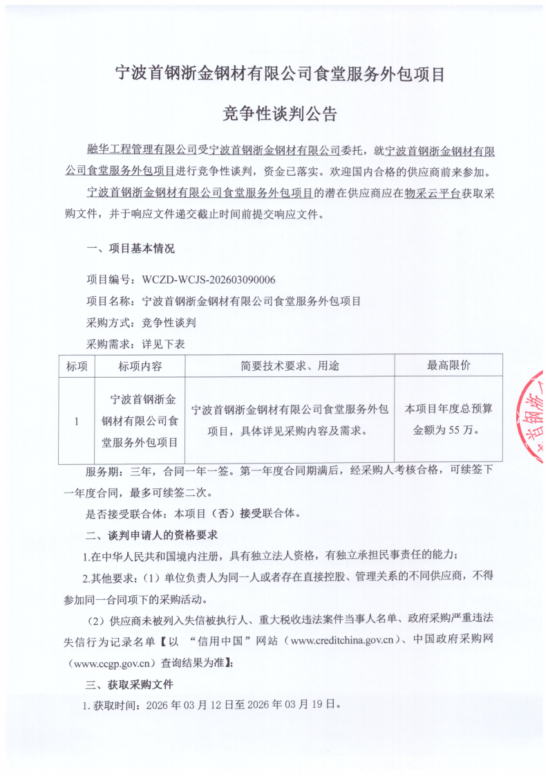 宁波首钢浙金钢材有限公司食堂服务外包项目竞争性谈判公告