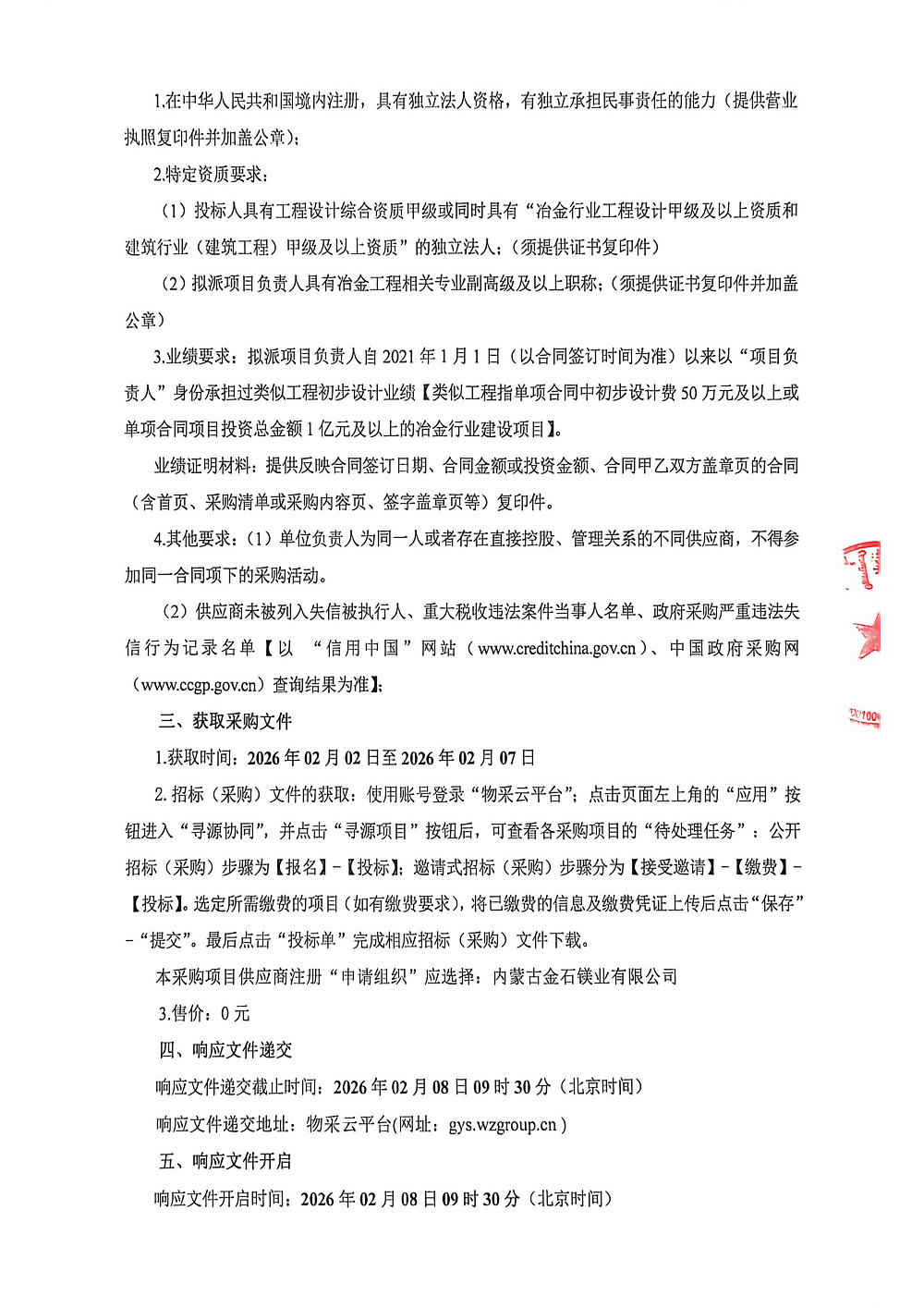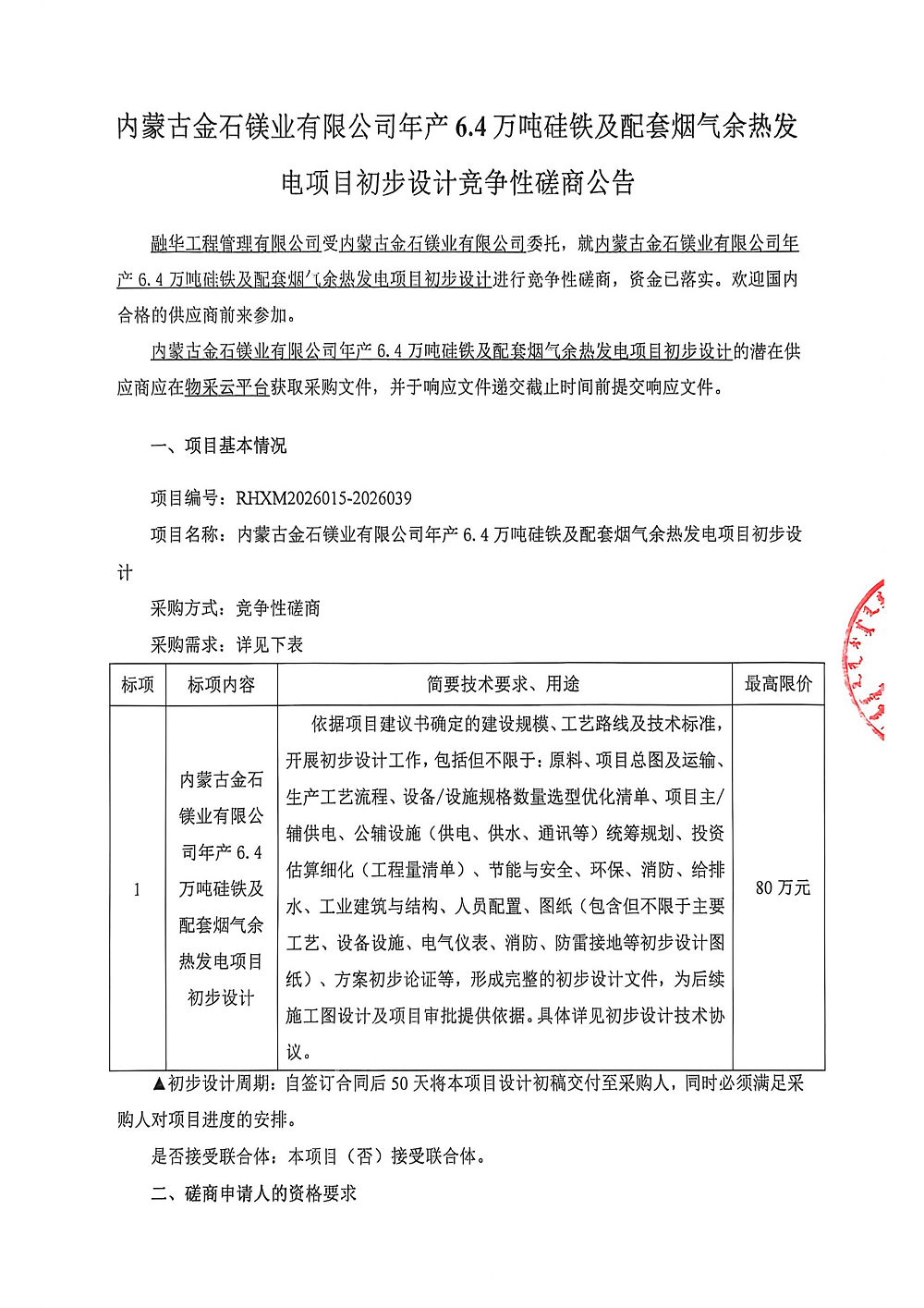 内蒙古金石镁业有限公司年产6.4万吨硅铁及配套烟气余热发电项目初步设计竞争性磋商公告