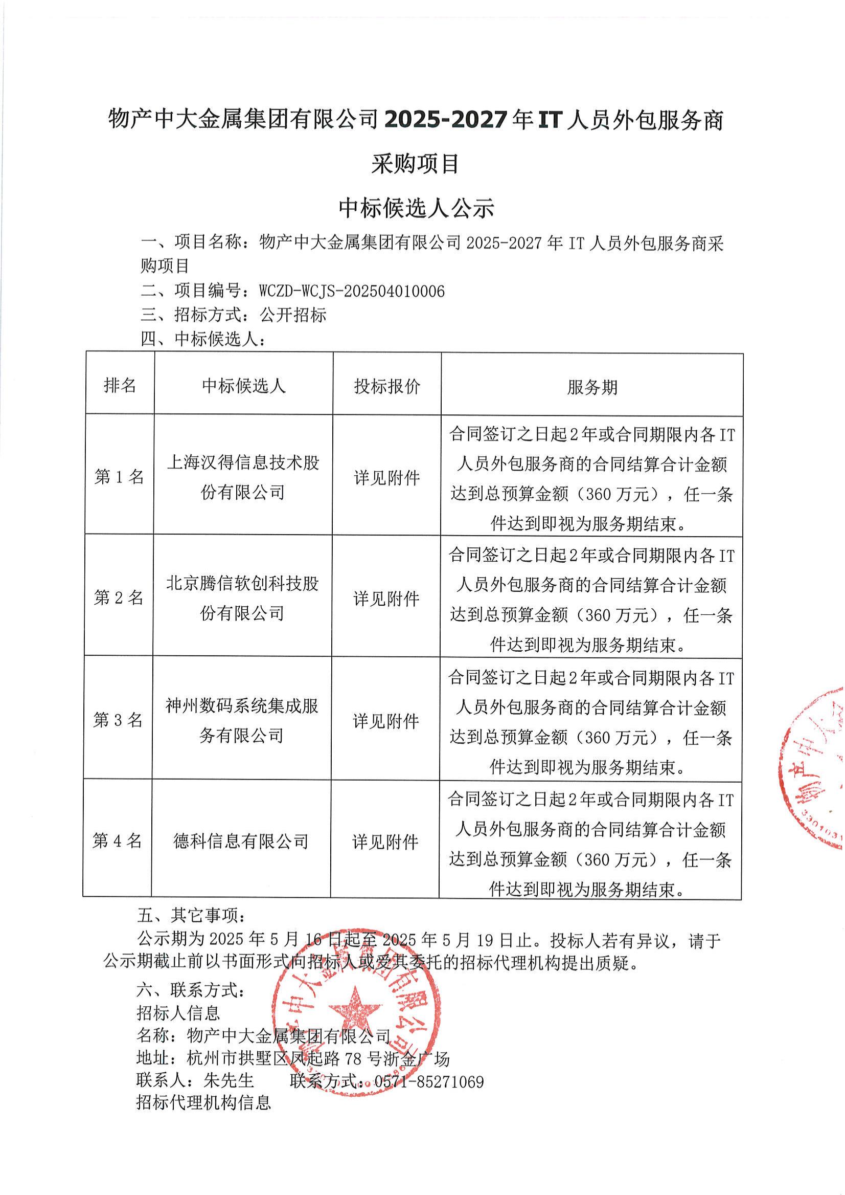 物产中大金属集团有限公司2025-2027年IT人员外包服务商采购项目中标候选人公示