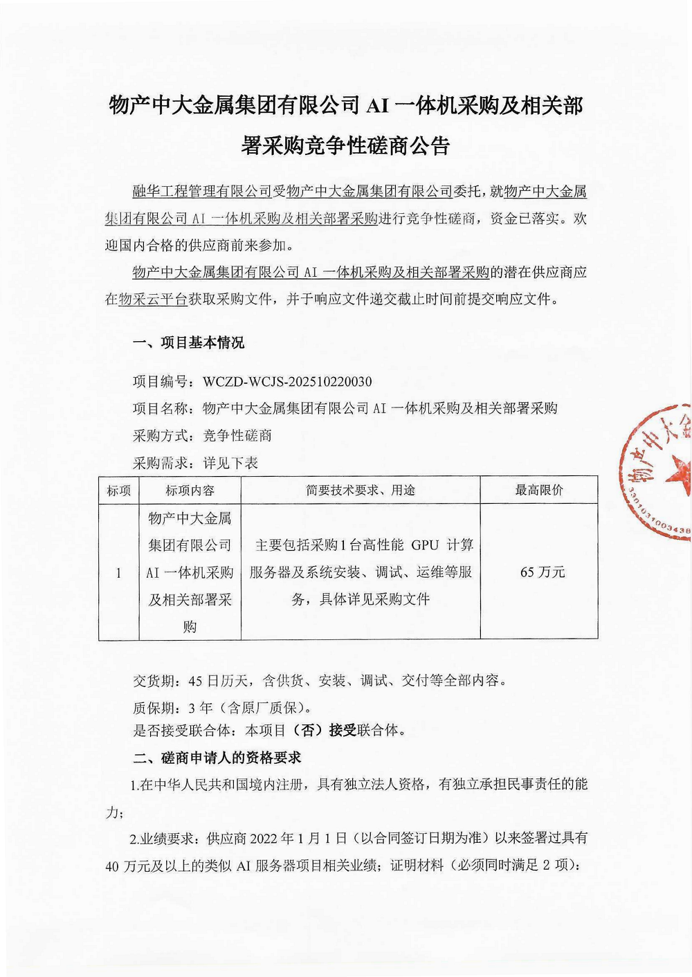 物产中大金属集团有限公司AI一体机采购及相关部署采购竞争性磋商公告