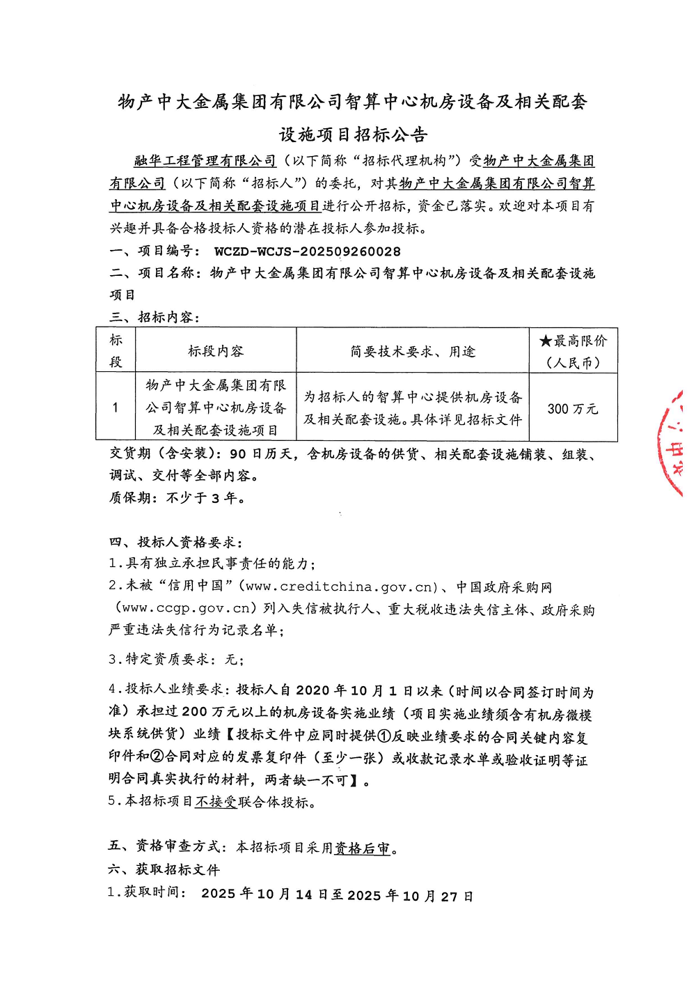 物产中大金属集团有限公司智算中心机房设备及相关配套设施项目招标公告