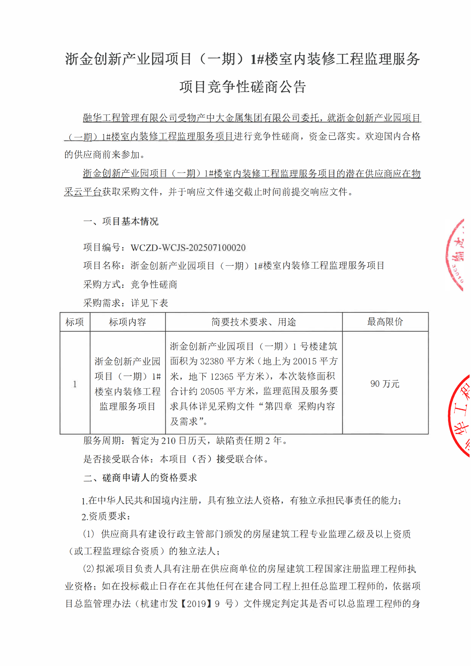 浙金创新产业园项目(一期)1#楼室内装修工程监理服务项目竞争性磋商公告