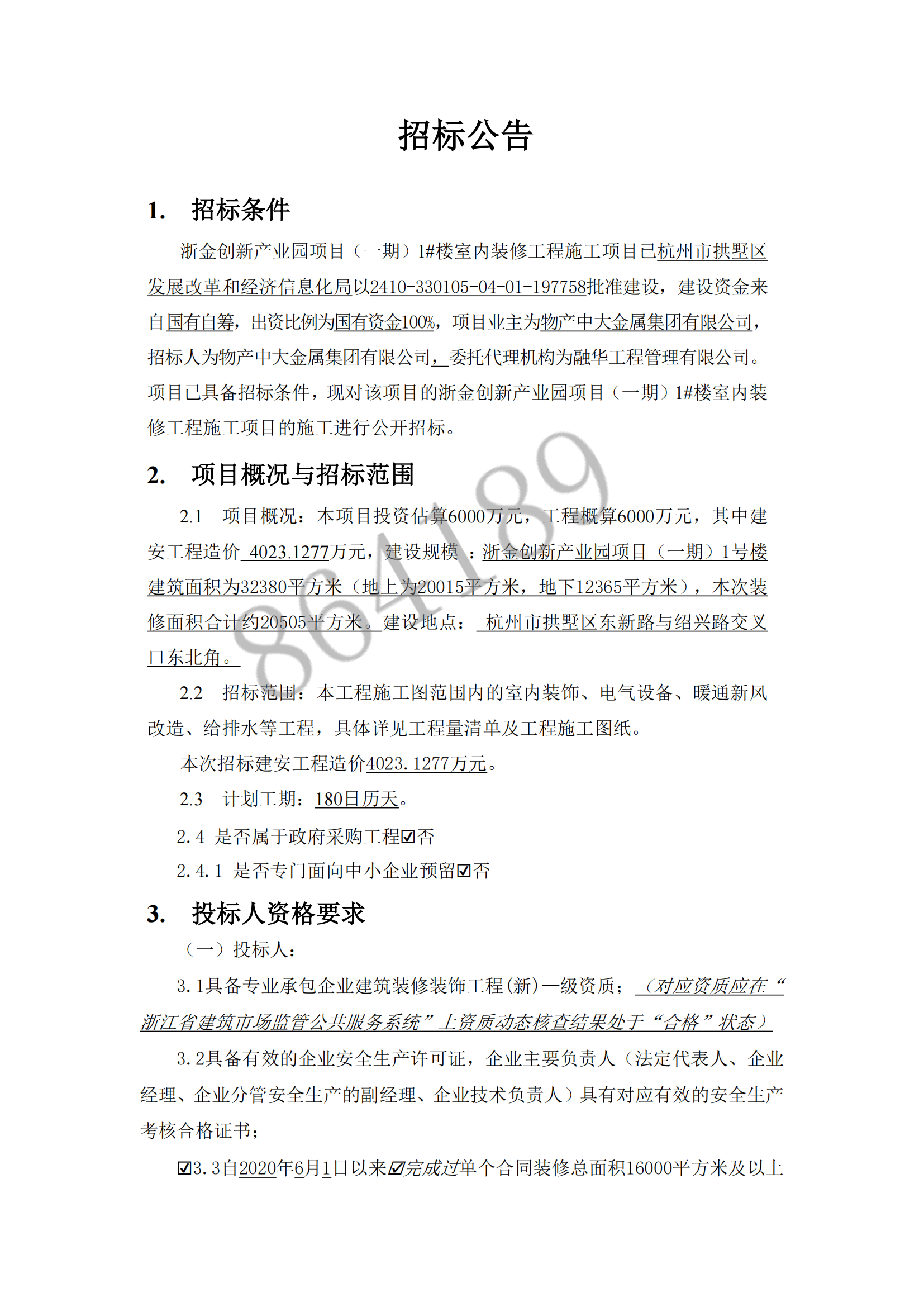 浙金创新产业园项目(一期)1#楼室内装修工程施工项目招标公告