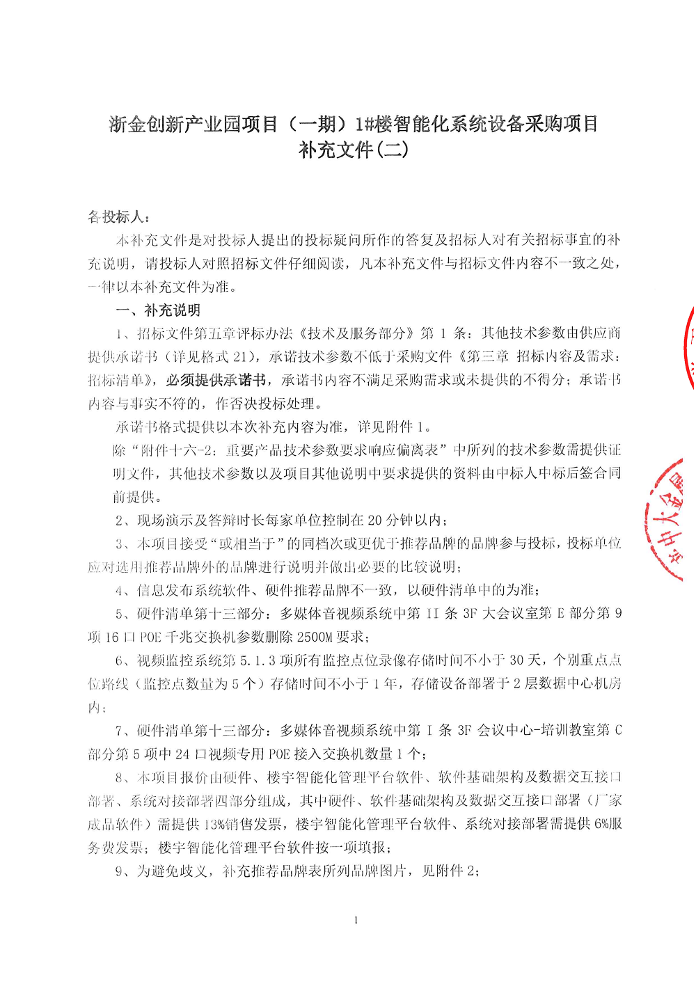 浙金创新产业园项目(一期)1#楼智能化系统设备采购项目补充文件(二)