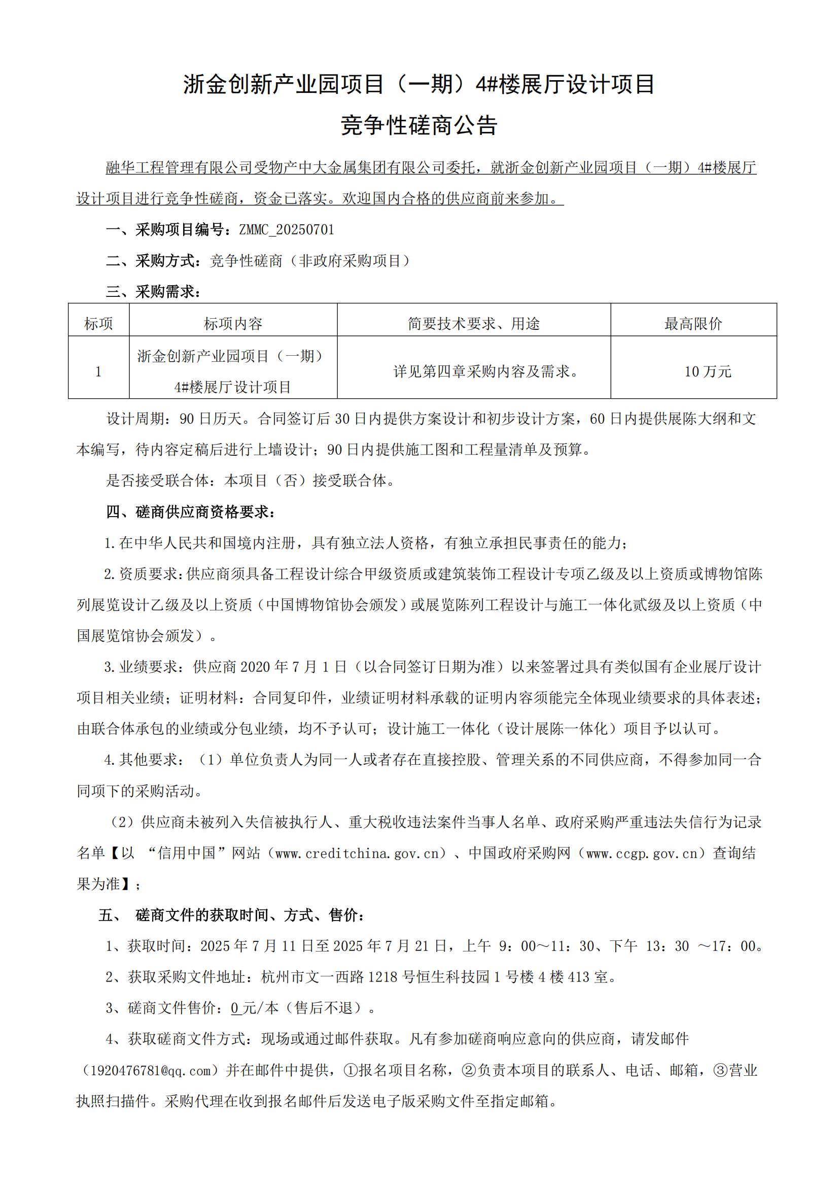 浙金创新产业园项目(一期)4#楼展厅设计项目竞争性磋商公告